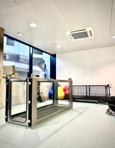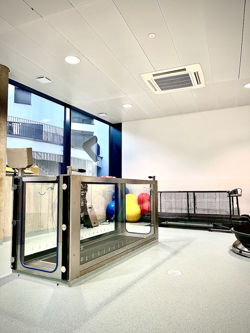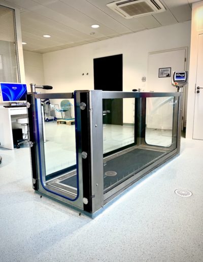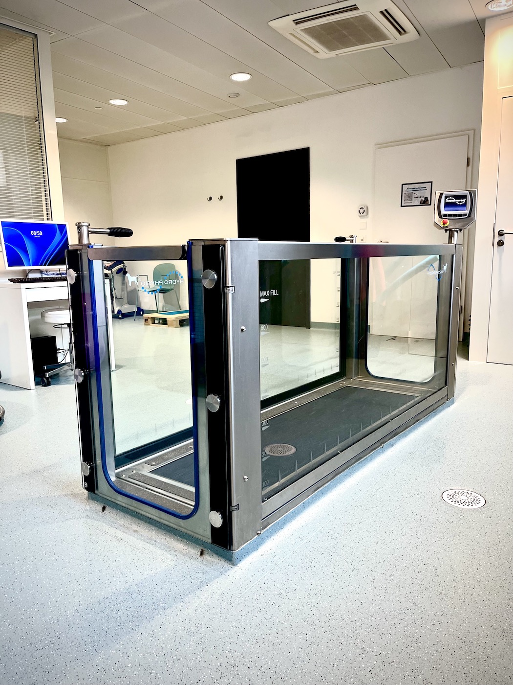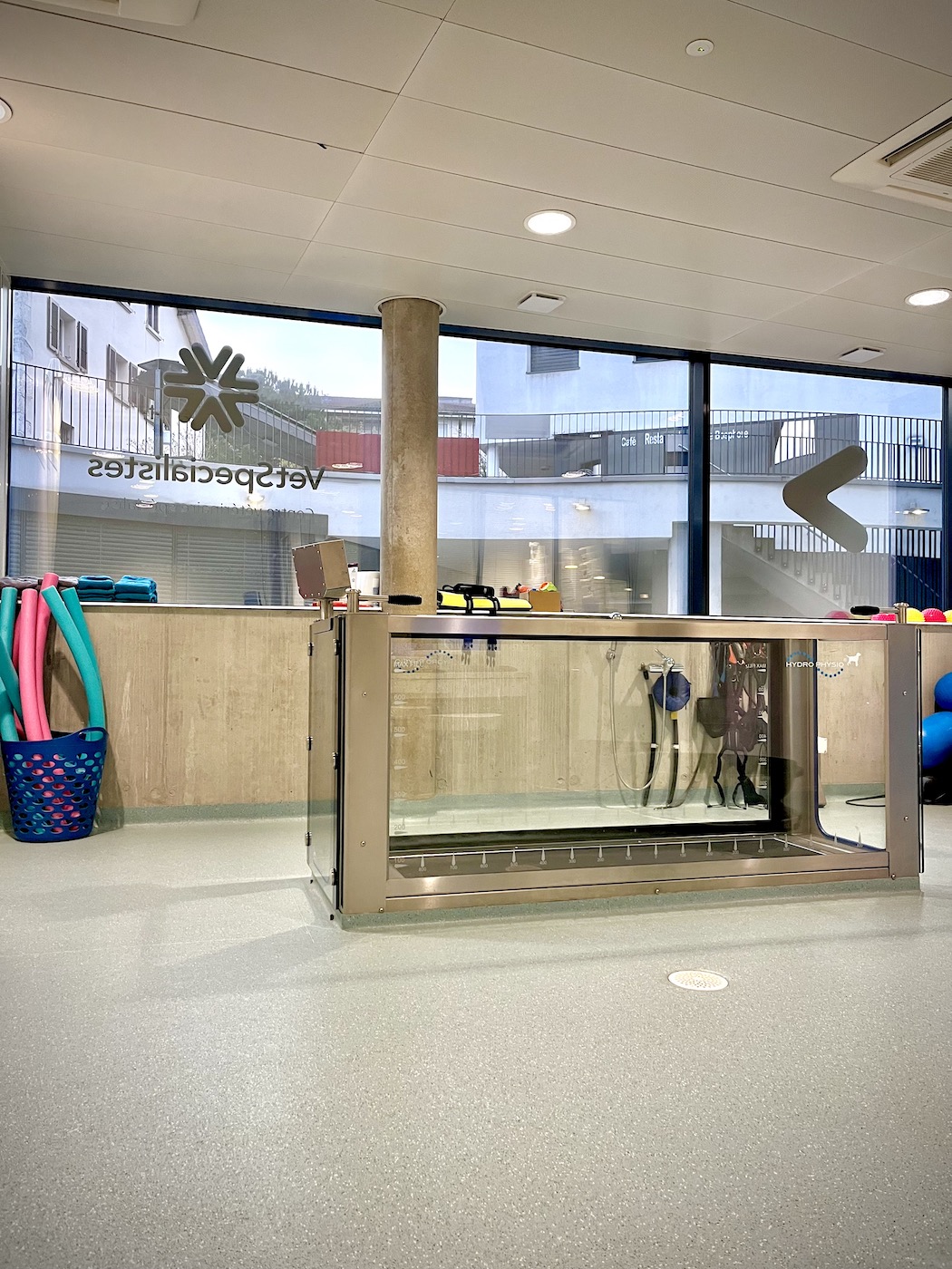 L’appareil HydroPhysio présent dans notre centre présente une longueur supérieure aux appareils classiques permettant d’accueillir de grands chiens ou bien des chiens de travail à l’entrainement (Voir notre section de médecine du sport). Une inclinaison du tapis est également possible afin de modifier les contraintes lors de la rééducation.